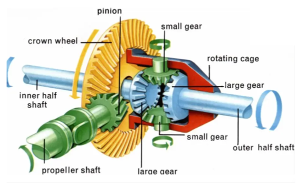 Bánh răng vi sai (Large gears): Bánh răng vi sai bao gồm 2 bánh răng được gắn trực tiếp vào hai bán trục, chính là các trục truyền động tới bánh xe.