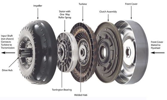 - Stator: Nằm giữa tuabin và bánh bơm, được cố định trên vỏ của hộp số. Chức năng chính của stator là dẫn hướng chất lỏng quay trở lại từ tuabin, từ đó chất lỏng đi vào bánh công tác theo hướng quay của bánh bơm. Stator sẽ làm tăng mô-men xoắn lên nhiều lần.