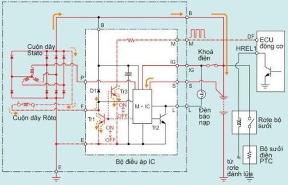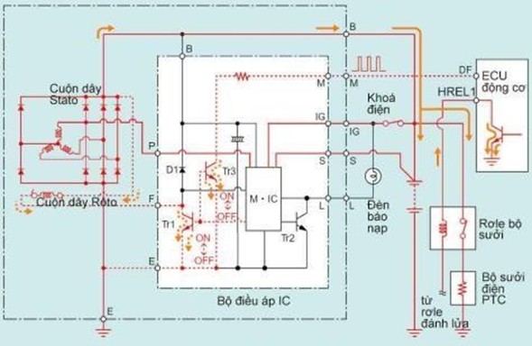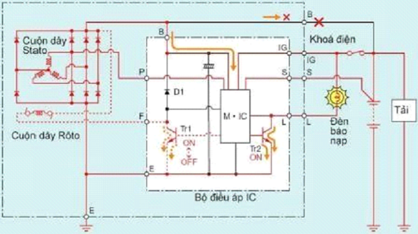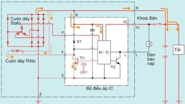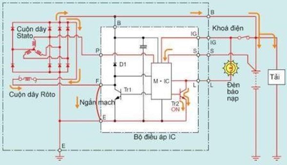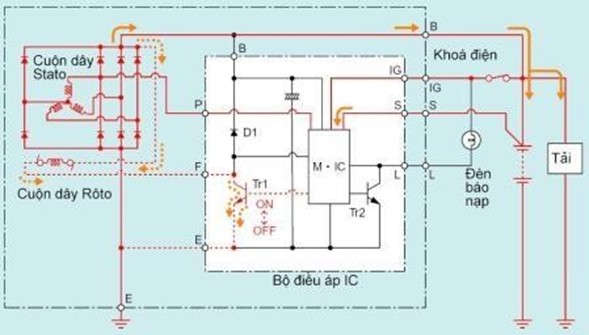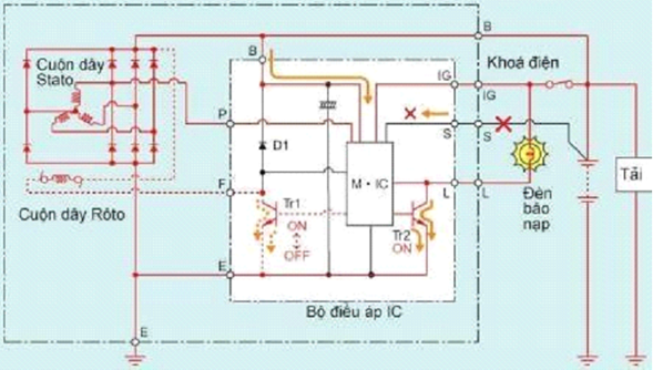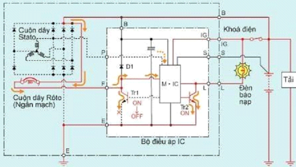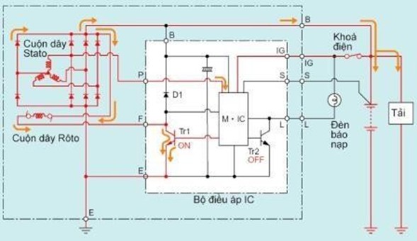 Tranzisto Tr1. Do đó dòng kích từ của cuộn dây rôto tăng lên và điện áp ở cực B cũng tăng lên. Bộ điều áp IC giữ cho điện áp ở cực S (điện áp ở cực ắc qui) ổn định (điện áp điều chỉnh) bằng cách lặp đi lặp lại các quá trình trên.