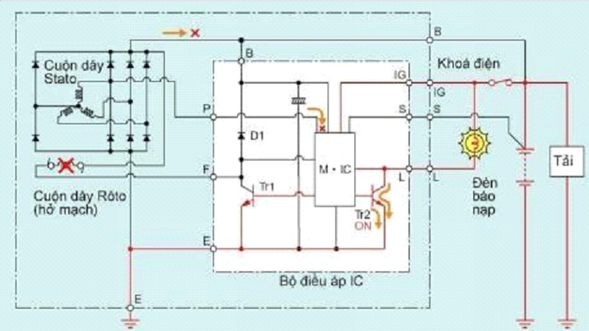 Khi máy phát quay, nếu cuộn dây Rôto bị đứt thì máy phát không sản xuất ra điện và điện áp ở cực P = 0. Khi mạch M.IC xác định được tình trạng này nó mở Tranzisto