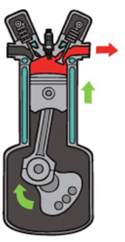 3.4. Kỳ xả: Xu páp nạp đóng, xu páp xả mở. Piston di chuyển từ điểm chết dưới (ĐCD) đến điểm chết trên (ĐCT). Trong quá trình này Piston đẩy toàn bộ lượng khí sản sinh trong quá trình đốt nhiên liệu ra ngoài qua của xả.