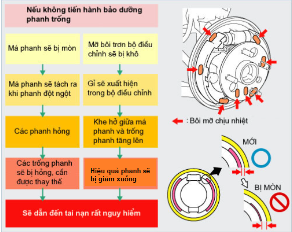 Do đó, việc bảo dưỡng hệ thống phanh là cần thiết. Có các mục bảo dưỡng liên quan đến hệ thống phanh như sau: