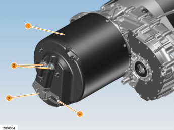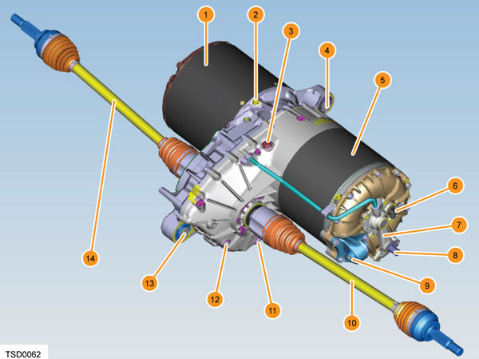 Trong đó: 1. Bộ điều khiển biến tần; 2. Ống thông hơi biến tần; 3. Ống thông hơi hộp số; 4. Gá lắp sau hộp số; 5. Động cơ điện; 6. Cảm biến tốc độ động cơ điện; 7. Ống làm mát; 8. Đường vào làm mát; 9. Gá lắp bên động cơ; 10. Trục truyền bên trái; 11. Nút xả dầu hộp số; 12. Nút tra dầu hộp số; 13. Giá lắp trước hộp số; 14. Trục truyền bên phải.