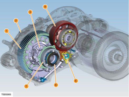 Trong đó: 1. Vành răng; 2. Vỏ hộp số; 3. Bánh răng vi sai; 4. Bánh răng trung gian; 5. Bơm dầu; 6. Phớt trục truyền; 7. Vòng bi vi sai