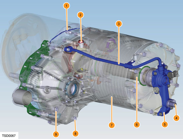 Trong đó: 1. Ống xả khí; 2. Ống thông hơi hộp số; 3. Đường ống làm mát; 4. Đường vào làm mát; 5. Đường ống làm mát; 6. Bộ làm mát rô tô; 7. Áo nước làm mát stato; 8. Nút xả dầu hộp số; 9. Nút tra dầu hộp số.