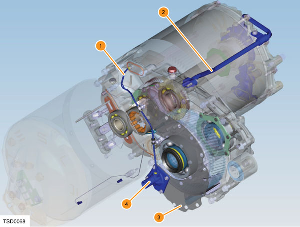 Trong đó: 1. Đường ống xả làm mát; 2. Đường ống làm mát; 3. Bộ làm mát hộp số; 4. Đường ống ra của bộ làm mát.