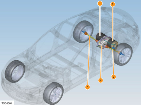 Trong đó: 1. Bộ điều khiển biến tần; 2. Động cơ điện; 3. Trục truyền bên trái; 4. Hộp số; 5. Trục truyền bên phải.
