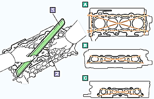 1 - Mép của thước thẳng; 2 - Thước lá; a - Phía thân máy; b - Phía đường; ống nạp; c - Phía đường ống xả