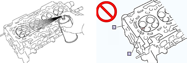 - Bôi một chất phát hiện vết nứt vào nắp quy lát và kiểm tra xem nó có bị hỏng hay nứt không. Kiểm tra nắp quy lát xem có bị nứt hay hư hỏng không bằng cách quan sát hay chất thấm có màu. Kiểm tra bằng chất thấm có màu cho phép phát hiện những vết nứt nhỏ mà khó kiểm tra bằng quan sát. Phương pháp kiểm tra này ứng dụng hiện tượng mao dẫn của chất lỏng để phát hiện vết nứt trên bất kỳ bề mặt nào. Trong phương pháp kiểm tra này, những loại chất lỏng sau đây được sử dụng: chất thấm (đỏ), dung dịch rửa (xanh) và thử (trắng).