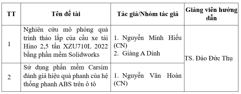 Căn cứ vào quyết định về việc thành lập Hội đồng khoa học và công nghệ đánh giá, nghiệm thu đề tài nghiên cứu khoa học cấp cơ sở năm 2024 của hiệu trưởng trường Đại học Thành Đông, khoa CNKT Ô Tô đã thành lập hội đồng nghiệm thu cấp khoa bao gồm: