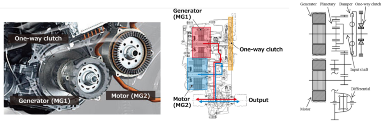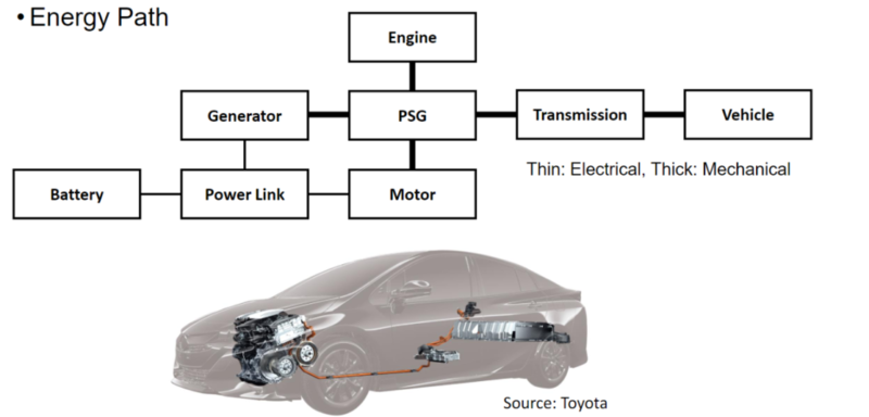 MG1 kiểm soát tốc độ quay của động cơ xăng bằng cách hấp thu hoặc cung cấp mô-men xoắn. MG2 trực tiếp truyền công suất đến bánh xe.
