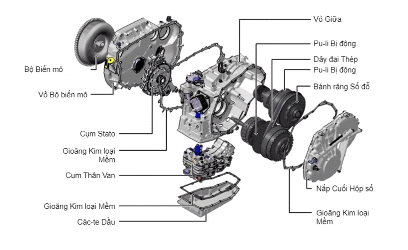 Hộp số CVT bao gồm các thành phần chính như sau: